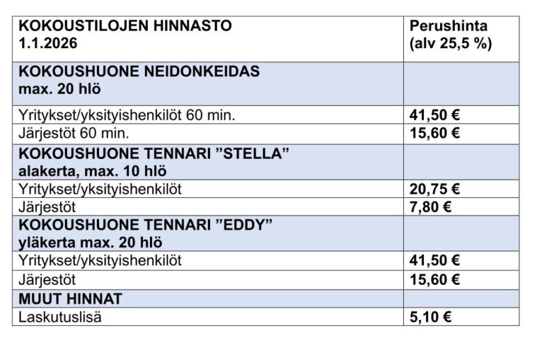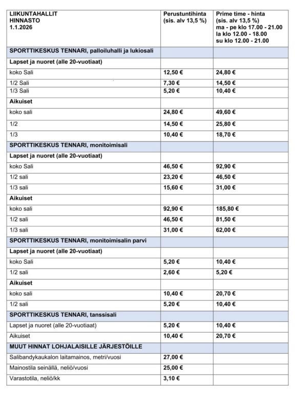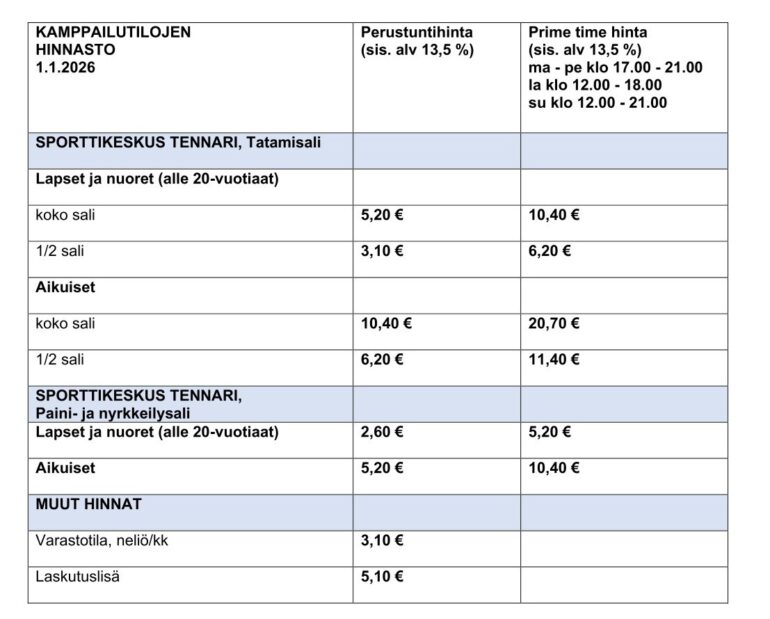 Sporttikeskus Tennarin hinnastot 1.1.2026 alkaen