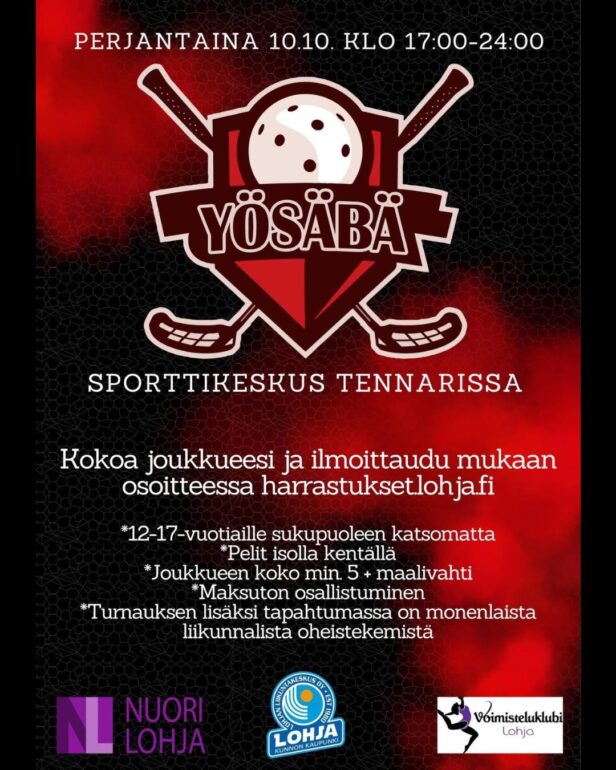 22.9.2025 Yösäbä pe 10.10. Sporttikeskus Tennarissa järjestetään myös tänä vuonna yösäbä perjantaina 10.10. Tapahtuma järjestetään yhdessä Nuori Lohja – Lohjan kaupungin nuorisotyön kanssa. Joukkueiden ilmoittautuminen osoitteessa harrastukset.lohja.fi Tapahtumassa muutakin liikunnallista tekemistä ellei säbän pelaaminen innosta.